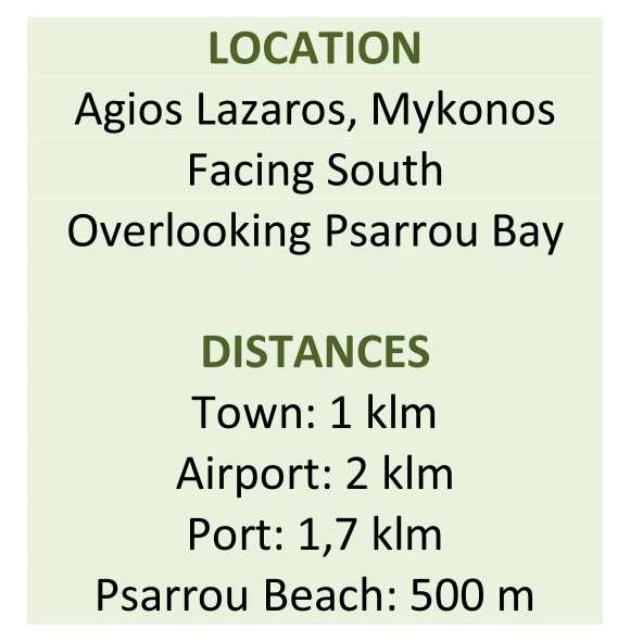 Situated in a unique location on the South part of Mykonos specifically on Agios Lazarus Hill with direct view to Delos, Rhinea, Paros, Naxos islands stands a highly luxurious villa complex has been built facing south respecting the local architecture and style consisting of 6 spacious villas, each built on own land with individual building plans accessible via private stone road with own, individually shaped swimming pool with infinite view.